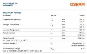 – Radiant Flux (@ 700mA): typ. 941 mW @ 25°C; typ. 885 mW @ 85°C