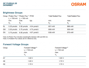 – Photon Flux (@ 700mA): typ. 5.70 μmol/s @ 25°C; typ. 5.42 μmol/s @ 85°C